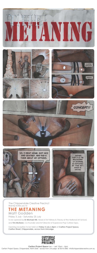 The Metaning is an art project by Matt Godden – a 22 page gallery wall scale graphic novel, with pages approximately 113x82cm in size. The Metaning is reportedly the first work of this nature created in Australia…